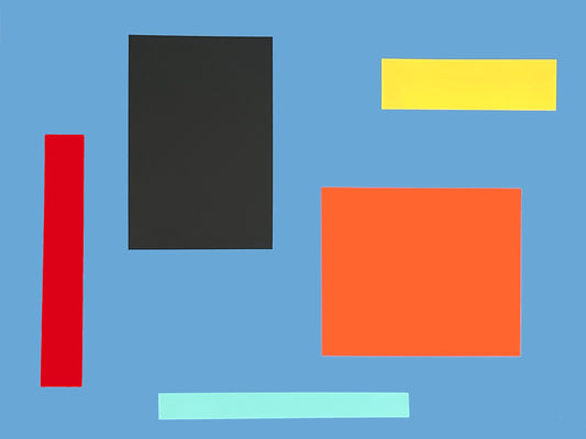 At the heart of the collection are the floating color compositions, in which bold, geometric forms — rectangles of