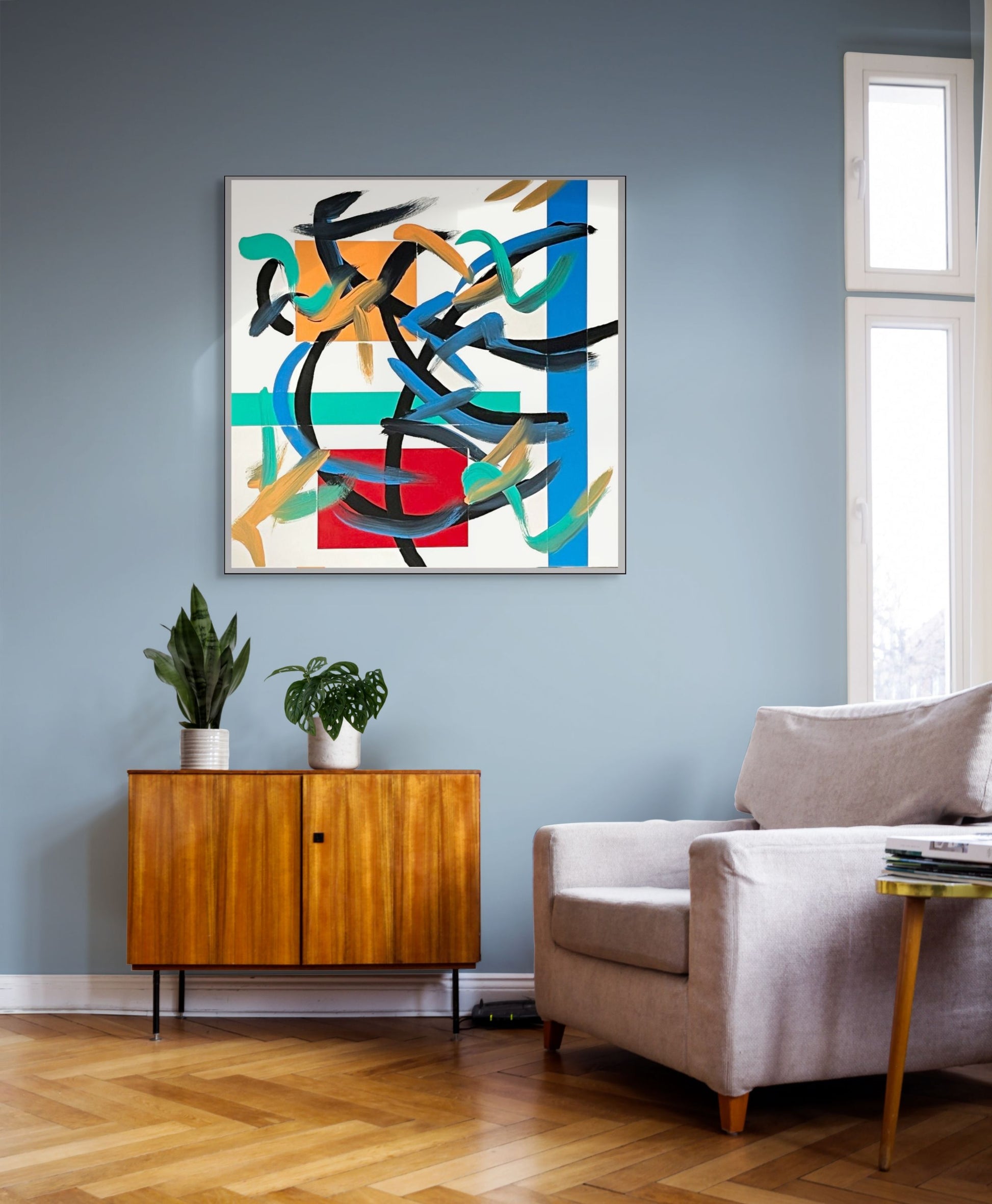 James Nowak’s Storm occupies a liminal space between chaos and order. At first glance, the painting seems to embody pure gestural abstraction—broad sweeps of teal, ochre, and black clash across the surface in storm-like turbulence. Yet embedded beneath this turbulence is a rigorous geometry: crisp planes of red, orange, teal, and blue establish a grid that pushes against the fluidity of the brushstrokes. This dialectic between freedom and containment is the conceptual core of Storm, situating it within the lineage of postmodern abstraction while also asserting Nowak’s individual voice.