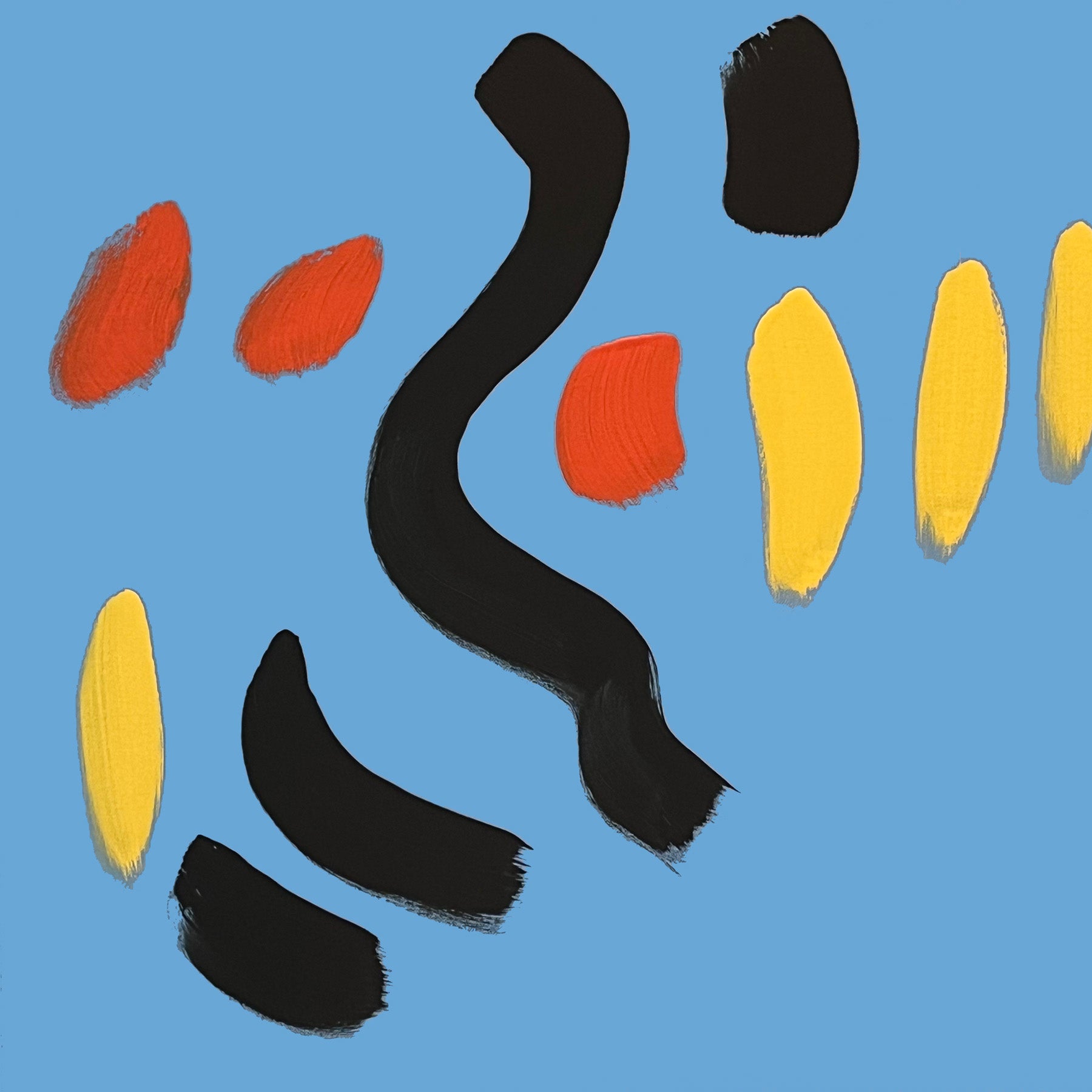The composition features a sparse but purposeful arrangement of strokes set against a cool blue ground. Thick black arcs and curves dominate, creating a strong rhythmic backbone, like bass lines grounding the piece. Yellow vertical strokes introduce brightness and momentum, while red-orange ovals act as accents—short, syncopated bursts of color.